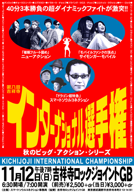 8回目を数える【 吉祥寺インターナショナル選手権 】。今回は、ゴーゴーなダンス・サウンドで乗り散らかすゴキゲンなグループが集結!秋にピッタリなビッグ・アクションを炸裂させます!ご期待下さい!!